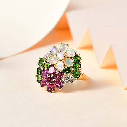 Indulge in the vibrant allure of our Rhodolite garnet, natural chrome diopside, white zircon, and Ethiopian opal cluster ring. This cluster ring features a captivating array of rhodolite garnet and chrome diopside gemstones, complemented by the iridescent charm of Ethiopian opals and the sparkle of white zircons. Set in 18K vermeil yellow gold plated sterling silver, this ring is a true testament to craftsmanship and elegance, perfect for adding a touch of luxury to any ensemble.