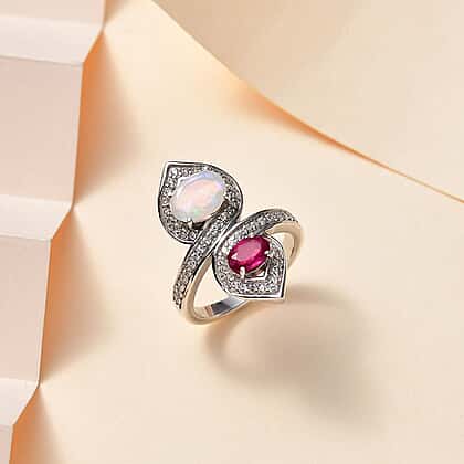 Ethiopian Welo Opal, Ruby & Natural Zircon Infinity Ring in Platinum Overlay Sterling Silver 2.00 Ct