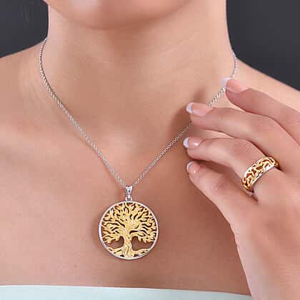 EverTrue 2 Piece Set - Ring (Size K) & Tree of Life Pendant with Chain (Size 20) in Yellow Gold Plated & Platinum Overlay