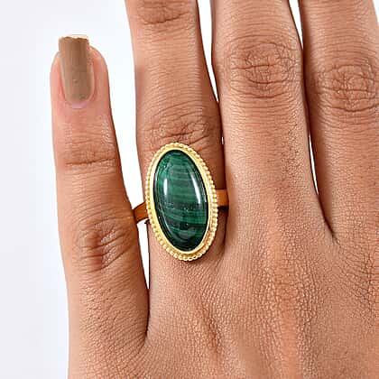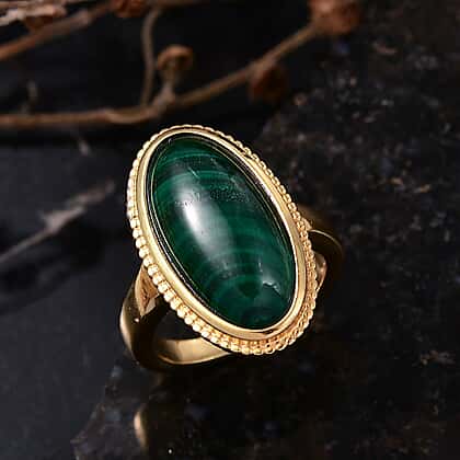 - Features an oval-cut malachite gemstone, creating a solitaire ring.