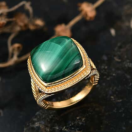 - Features a cushion-cut malachite gemstone as the centre stone.