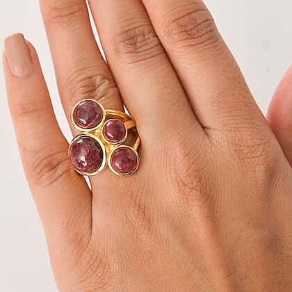 Some times of year call for something extra special on those occasions opt for this EverTrue bubble ring made from natural thulite to stand out from the crowd. Crafted in yellow gold plated sterling silver, this openstyle ring features a sleek shank. It entails four smooth cabochons of round natural thulite in reddish-pink tones. The clustered design creates a sculptural look, almost like a little arrangement of polished stones captured in motion. It is expressive without being loud, making it a perfect piece for someone who loves romantic pieces with a bit of personality.The rounded shapes add softness, while the split shank band gives the ring balance and lightness.