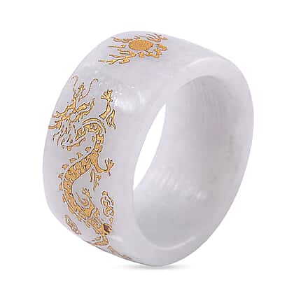 Designed just for you, this natural type A white jade dragon carved stone band ring is a bold, symbolic piece with deep cultural roots and unmistakable style. Handcrafted from rare, untreated white jade—sourced for its natural lustre and strength—this wide band showcases a detailed golden dragon engraving, symbolising prosperity, wisdom and protection. The ring's polished surface offers a smooth, comfortable fit, while the robust jade ensures it stands up to everyday wear. With its commanding silhouette and heritage-inspired artistry, this ring embodies personal power and confidence. It’s a unique treasure for those who value spiritual symbolism, self-expression, and the beauty of meaningful design.