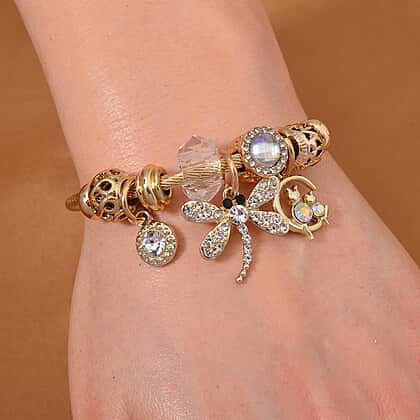 Multi Colour Ceramic Beads Enamelled Charms Dragonfly Adjustable Bracelet in Gold Tone