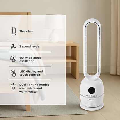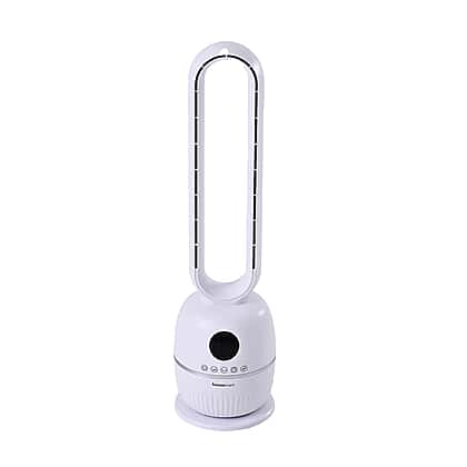 Stay cool in style with the Homesmart Bladeless Tower Fan, designed to elevate your comfort without compromising on aesthetics. Crafted from durable ABS in crisp white, this sleek fan stands 86cm tall and fits seamlessly into any space. It offers 3 speed levels, 60° wide-angle oscillation, and manual tilt up to 15° for perfect airflow control. The LED display and touch controls are easy to use, and the handy remote makes adjustments effortless. With a 12-hour timer and dual lighting modes (cold white and warm white), it’s ideal for bedroom, office, or living room use—all powered by a 60W motor.