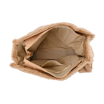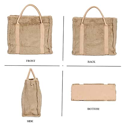 Faux Fur Plush Tote Bag with Handle Drop - Khaki