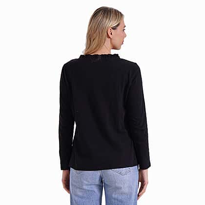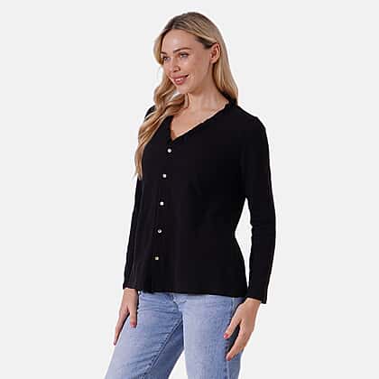 Add a graceful touch to your everyday style with the La Marey Pure Cotton Button Up Frill Collar Shirt in Black. Made from 100% cotton, this shirt is soft on the skin and comfortable enough for all-day wear. The flattering V-neck is complemented by a delicate frill collar that highlights the neckline and adds an elegant finish. Designed with long sleeves and a button-up front, it's easy to dress up or down for workdays, casual outings, or evenings out. The classic black colour makes it easy to pair with skirts, jeans, or trousers for a refined and effortless look.