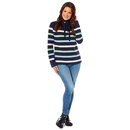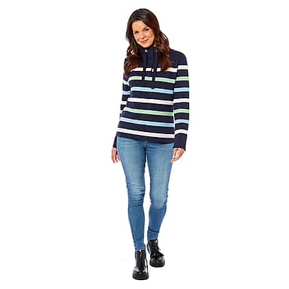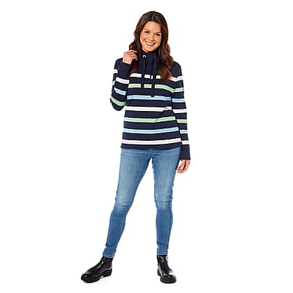 Experience the epitome of comfort and style with this ladies cotton striped sweatshirt. Made from soft, breathable cotton, this sweatshirt ensures all-day comfort. Featuring a unique button neck design, the button-down feature allows you to customise your look effortlessly. This classic piece gets a fashionable twist with the added trendy collar drawstring.