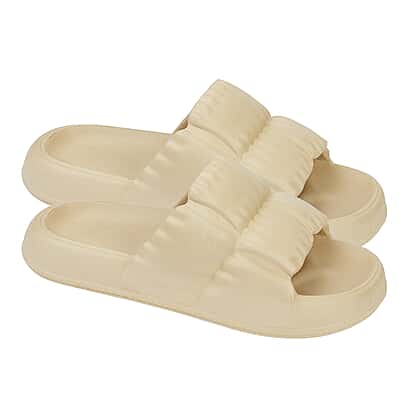 Step into comfort and style with the Jo and Joe MIAMI Ladies puffer slide slip-on, flip-flop slipper. These slip-on slippers are crafted from premium EVA material, making them soft, lightweight, and flexible, perfect for all-day wear. The pleated-styled vamp adds a touch of elegance and charm, making these slippers comfortable and fashionable. The non-skid sole ensures safety with wave-patterned treads and tunnel grooves for excellent traction. Designed with an ergonomic footbed, these slippers provide superb support for your feet, making them ideal for indoor and outdoor activities.