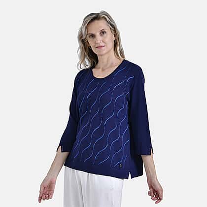Bring a touch of sophistication to your wardrobe with this La Marey navy blouse. Crafted from a breathable viscose-nylon blend, it offers comfort without compromising style. The front features an elegant wave design that catches the light beautifully, while the 3/4 sleeves with button details add understated charm. The round neckline and side-cut hemline give a flattering fit, making it easy to pair with tailored trousers or jeans. Perfect for both work and weekend wear.