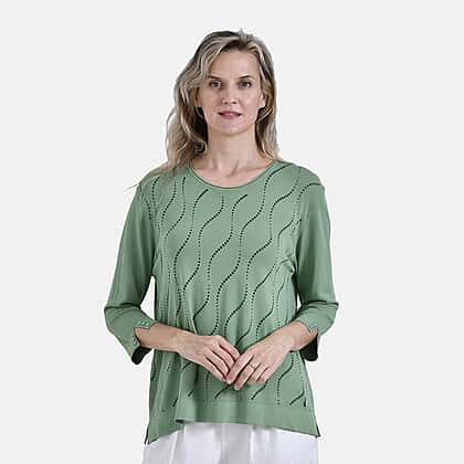 Refresh your wardrobe with this La Marey 3/4 sleeve blouse in soft olive green. Crafted from a smooth viscose and nylon blend, it offers lasting comfort and a flattering shape. The wave-patterned front adds texture and sophistication, while button details at the sleeve ends lend a polished touch. Finished with a round neckline and side cuts for ease of movement, this blouse is effortlessly versatile for daytime outings or relaxed evenings.