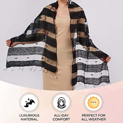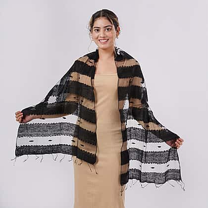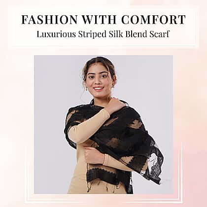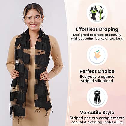 Add a touch of elegance to any outfit with the 30% Silk and Modal Printed Women's Scarf in Black. Crafted from a luxurious silk and modal blend, this scarf feels beautifully soft and drapes effortlessly. The bold striped design and lightly fringed edges bring texture and style, making it a versatile accessory for both day and evening wear. Measuring 175 x 60 cm, it’s the perfect size for layering around your neck, shoulders, or handbag. Whether dressing up a simple top or complementing a classic coat, this piece adds timeless sophistication to your look.