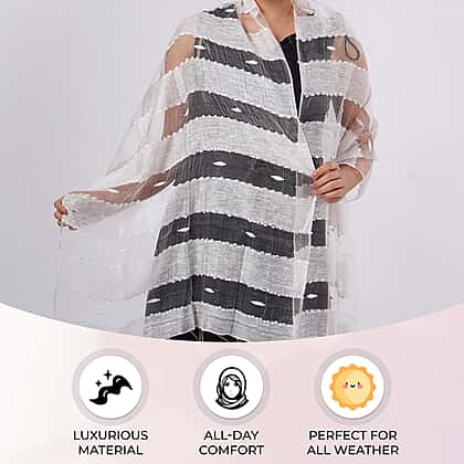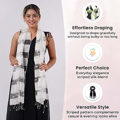 Elevate your outfit with the 30% Silk and Modal Printed Women's Scarf in White. The lightweight silk-modal fabric drapes gracefully, offering a soft feel and an effortlessly elegant look. Featuring a chic striped pattern and fringed edges, this versatile accessory adds depth and movement to any style. At 175 x 60 cm, it’s the ideal size for layering over blouses, jackets, or dresses. Perfect for both casual wear and evenings out, this scarf adds a polished finish with understated charm.