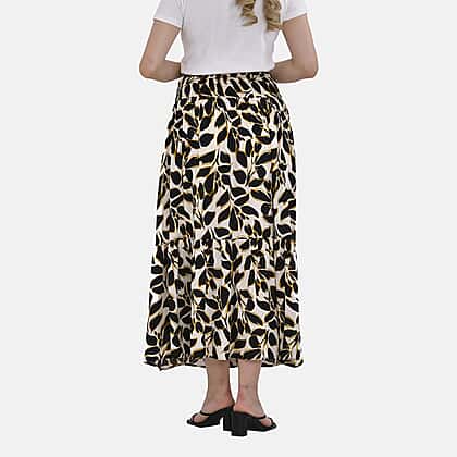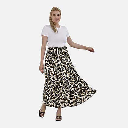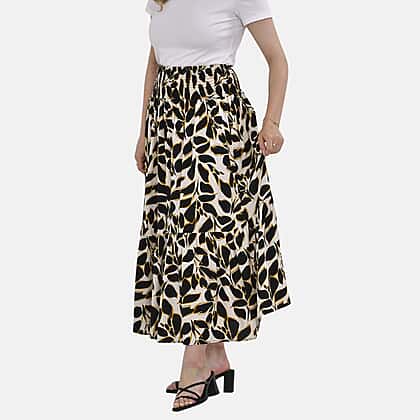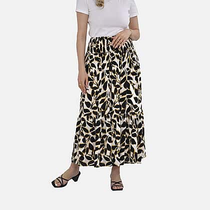 Elevate your summer style effortlessly with this Tamsy elastic waist maxi skirt featuring a striking black-and-white leaf pattern accented with subtle yellow highlights. This skirt brings a vibrant touch to your wardrobe, perfect for brightening up any casual or formal outfit. Designed with a comfortable elastic waistband, it provides ease of wear throughout the day. Crafted from soft, high-quality 100% viscose, this maxi skirt feels gentle and lightweight, making it ideal for warm weather. Versatile enough to dress up or down, it's a wonderful choice for days at the office, shopping trips, holidays, dinner dates, and relaxing evenings out.
