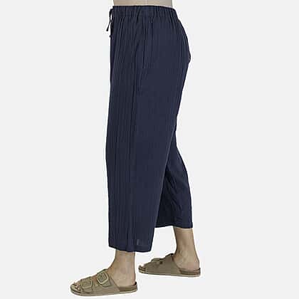 Enjoy effortless style with the TAMSY pure cotton elasticated waist cropped trouser, designed for all-day comfort. Crafted from 100% cotton double gauze, these trousers provide a lightweight and skin-friendly feel, making them ideal for warm weather. The elasticated waistband with an adjustable drawstring ensures a flexible and secure fit, while the cropped length with a 60 cm inseam adds a relaxed touch. Complete with side pockets for practicality, these versatile trousers are perfect for casual outings, holidays, or lounging at home. The classic navy shade pairs well with various tops, making styling easy.