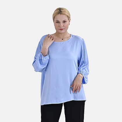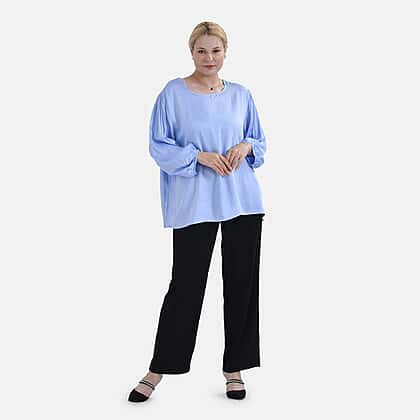 Capture the attention with this TAMSY round neck top in a soft blue tone, crafted from 100% viscose for a smooth and breathable feel. Its relaxed silhouette drapes beautifully over the body, offering both comfort and elegance in one effortless piece. The round neckline and gently gathered long sleeves with elasticated cuffs create a timeless, feminine appeal. Perfect for pairing with trousers or jeans, this versatile top transitions easily from casual outings to laid-back evenings. The lightweight fabric ensures all-day comfort while adding a touch of understated sophistication to your look.