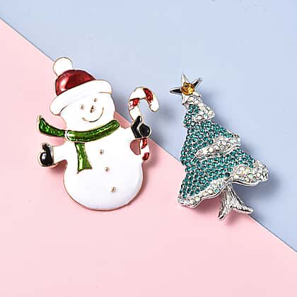 2 Piece Set - Multicolour Austrian Crystal (Rnd) Snowman and Christmas Tree Enamelled Brooch