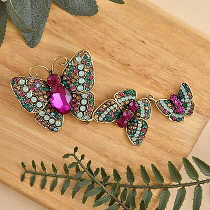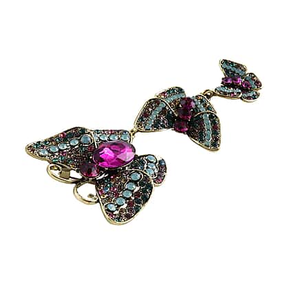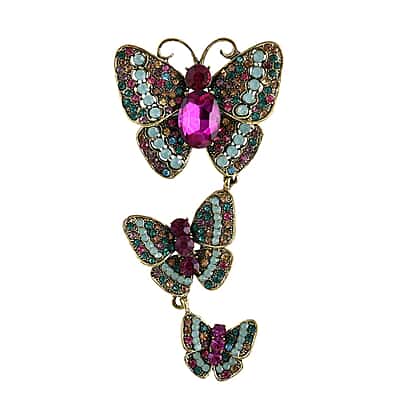 The beautiful hues and minimalist design of this butterfly brooch will create an antique to be adorned with any outfit setting you wish to carry. This brooch is crafted in the shape of three butterflies cascading down, connected with the prominent-sized fuchsia, exuding its out-of-ordinary shades. The round cut of multi-Austrian crystals completes the look of the butterfly and creates a setting that will grace your evening looks.