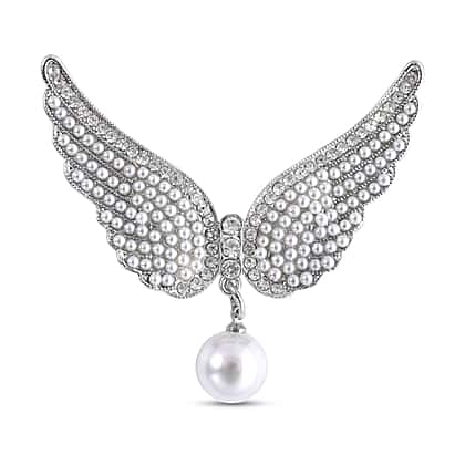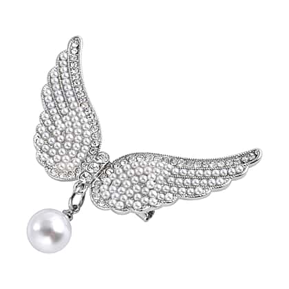 White Austrian Crystal and Simulated Pearl Angel Wings Brooch in Silver Tone