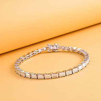 Feel the world's love for diamonds, but want something that looks won’t cost you a fortune? This moissanite tennis bracelet is an accessory that will give you the dazzle of diamonds and have you looking like a million bucks! The band, crafted from 8.9 grams of silver, is studded with 5x3mm moissanites weighing 17.34 Carat. The design is finished with a sparkling rhodium overlay that adds durability.