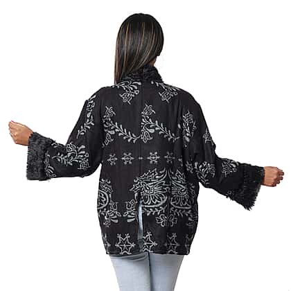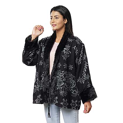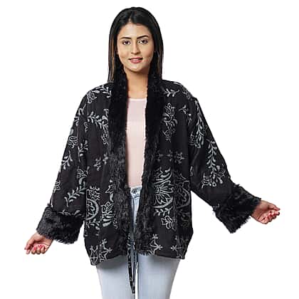 Floral Damask Pattern Cosy Jacquard Jacket with Faux Fur Trim and Long Sleeve (Size M-L, 10-16) - Black