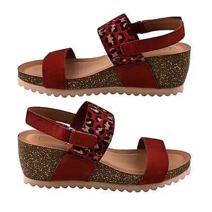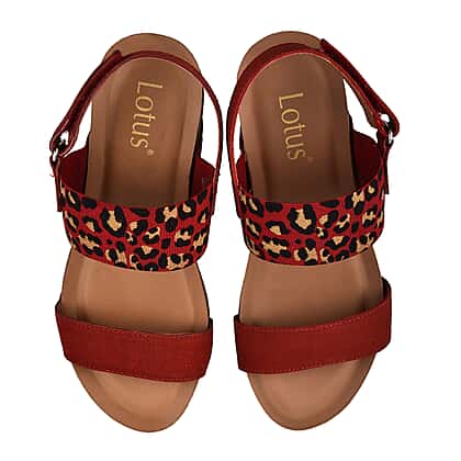 Give your feet the comfort and style they deserve with this beautiful Lotus Brielle wedge sandal. It is made from leather, featuring a toe strap and an adjustable rip-tape sling back. Also, it boasts an elasticated strap that features a striking animal print to add a touch of bling. This beautiful red sandal features a 6 cm cork effect wedge heel to give you a comfortable grip while walking. Style these sandals with your western wear wardrobe collection to enhance the look.