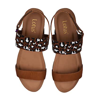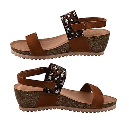 Give your feet the comfort and style they deserve with this beautiful Lotus Brielle wedge sandal. It is made from leather, featuring a toe strap and an adjustable rip-tape sling back. Also, it boasts an elasticated strap that features a striking animal print to add a touch of bling. This beautiful tan sandal features a 6 cm cork effect wedge heel to give you a comfortable grip while walking. Style these sandals with your western wear wardrobe collection to enhance the look.