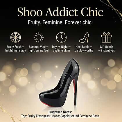 The Laurelle Shoo Addict Chic Eau de Parfum spray is a captivating fragrance designed to add elegance to any occasion, day or night. This scent opens with a burst of fruity freshness, ideal for the summer season, layered over a sophisticated, feminine base. The 100ml perfume bottle, shaped as an exotic high heel with a glamorous gold finish, makes a stylish addition to any dressing table and an eye-catching statement piece. A perfect gift choice, this eau de parfum combines bold style with a long-lasting, alluring scent that will leave a memorable impression.