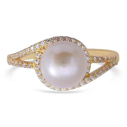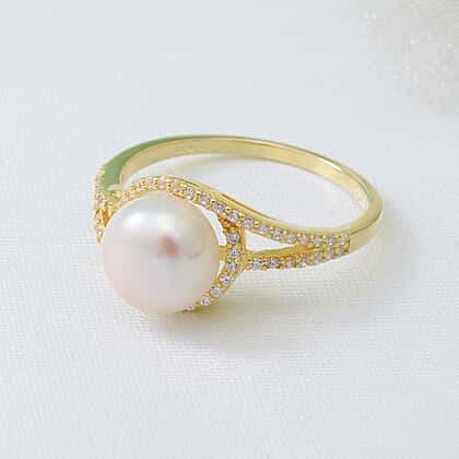 Fresh Water Pearl and Simulated Diamond Ring in Vermeil Yellow Gold Plated Sterling Silver
