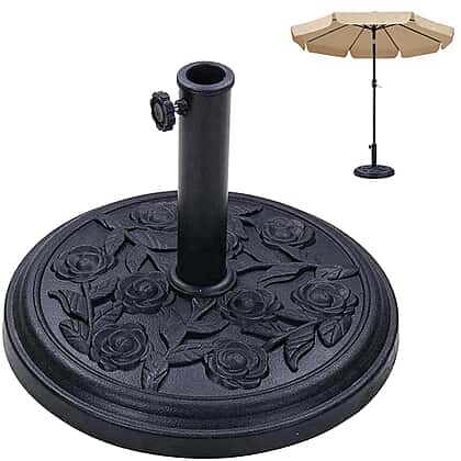 Keep your garden parasol secure with this 9kg Cast Iron Effect Parasol Base. Designed to provide solid support, it features an adjustable tightening knob to fit various umbrella pole sizes, ensuring stability even in breezy conditions. Its cast iron effect finish adds a touch of style to your outdoor space while offering reliable functionality. Ideal for use in gardens, patios, and decking areas, this base is easy to assemble and requires no tools, making it a convenient choice for keeping your parasol steady and your outdoor area shaded.