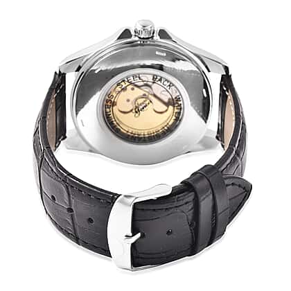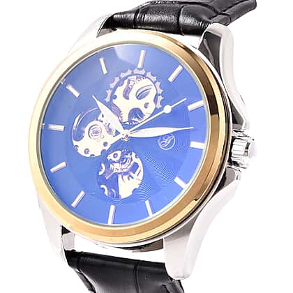 GENOA Automatic Mechanical Movement Blue Dial Water Resistant Skeleton Watch with Black Leather Strap