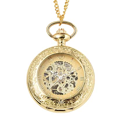 GENOA Automatic Mechanical Movement Skeleton Pocket Watch with Chain and Openable Case in Yellow Gold Tone