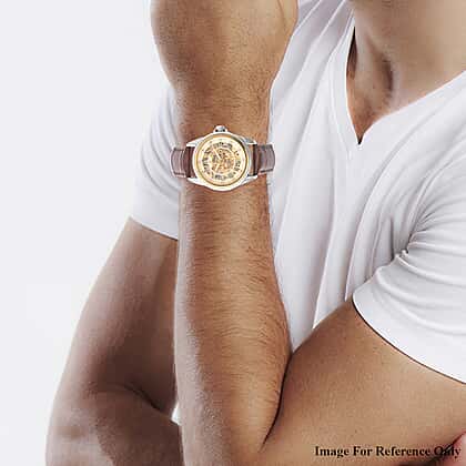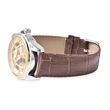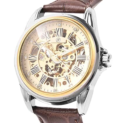 GENOA Automatic Mechanical Movement White Austrian Crystal Studded Water Resistant Skeleton Watch with Brown Leather Strap