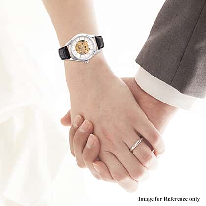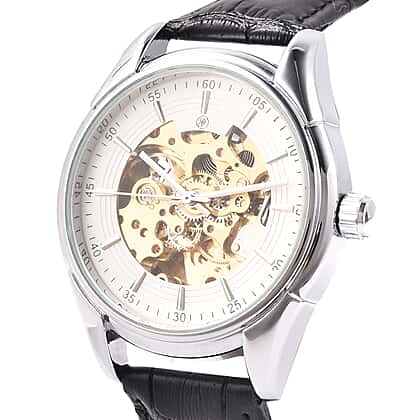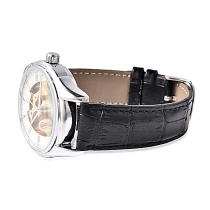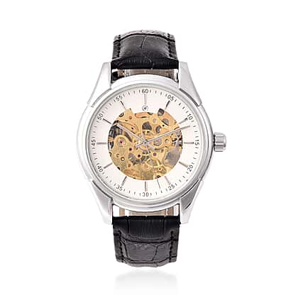 GENOA Automatic Mechanical Movement White Dial Water Resistant Skeleton Watch with Black Leather Strap