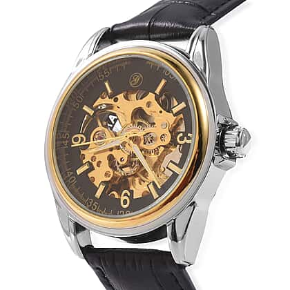 GENOA Automatic Movement Skeleton Water Resistant Watch with Black Leather Strap in Dual Tone