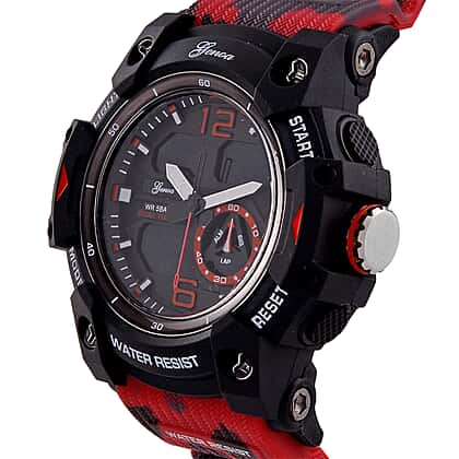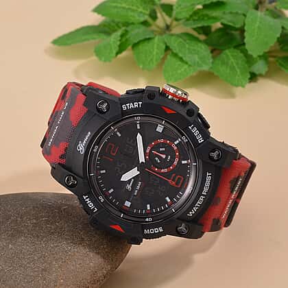 Experience reliability and rugged style with the GENOA Time V2 Camouflage Multifunction Watch. Designed for versatility, this timepiece combines a black plastic case with multifunctional keys and a bold black dial featuring LED elements and an inner ring. The camouflage TPU strap with a stainless steel buckle ensures a secure and comfortable fit. Powered by Japan PC21S movement and an electronic movement, it offers functions like time, date, week, stopwatch, alarm, and night light. With 5ATM water resistance, this watch is built for daily adventures. Its durable construction and practical features make it a perfect companion for outdoor activities.