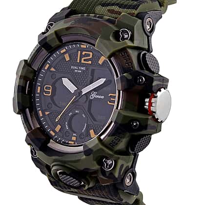 Stay ahead of time with the GENOA TIME V2 Japanese Men’s Watch. Featuring a sleek black dial, this watch offers both style and functionality with its multifunctional design. The camouflage strap adds a modern touch, while the LED display provides easy readability. Powered by the reliable PC21S Japan movement, this watch includes time, week, date, stopwatch, alarm clock, and night light functions. With 5ATM water resistance, it's perfect for daily wear. The stainless steel buckle and back ensure long-lasting use, making this watch a practical addition to your collection.