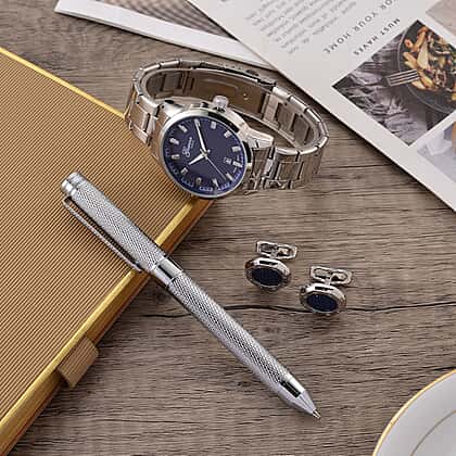 GENOA TIME V2 Quartz PC32 3ATM WR Blue Hydraulic Dial Mens Gift Set with Silver Stainless Steel Strap, Pen & Cufflinks