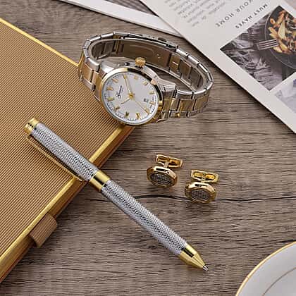 GENOA TIME V2 Quartz PC32 3ATM WR White Hydraulic Dial Mens Gift Set with Two-Tone Stainless Steel Strap, Pen & Cufflinks