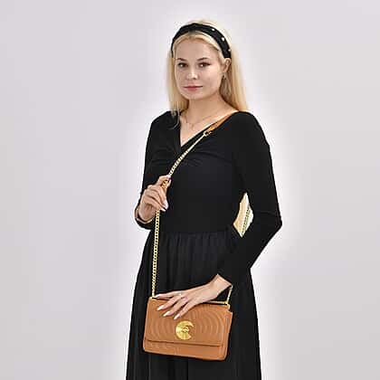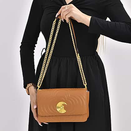 Genuine Leather Clover Pattern Crossbody Bag with Shoulder Strap - Tan