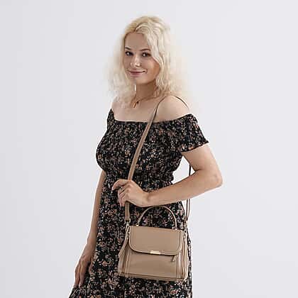 Genuine Leather Top Handle Satchel Bag with Adjustable Long Shoulder Straps - Khaki
