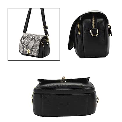 Genuine Leather Womens Snake Print Crossbody Bag with Shoulder Strap - Black