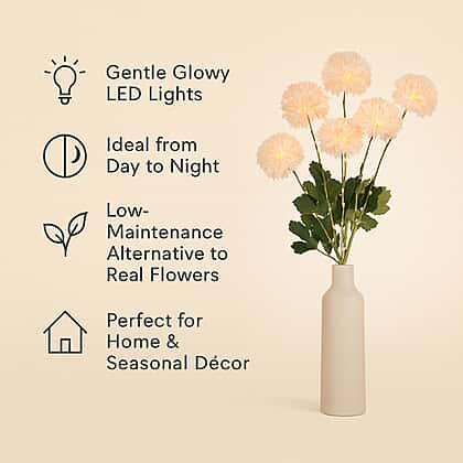 Transform your interior with this set of 2 Faux Flower Branches with LED Lights in soothing and classy Champagne colour. Each branch is adorned with LED lights that showcase a gentle glow, making it ideal for day to night. Crafted to uplift your home decor, these are perfect for centerpieces that add an instant pop of colour to any space. Give your space this home decor that creates a welcoming ambiance, ideal for every corner of the home.