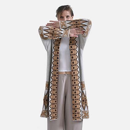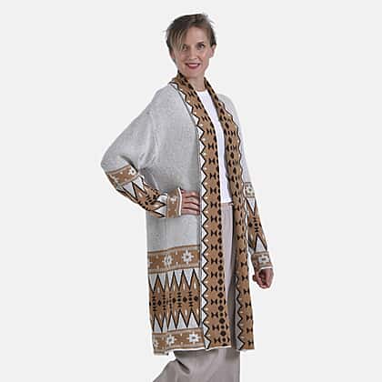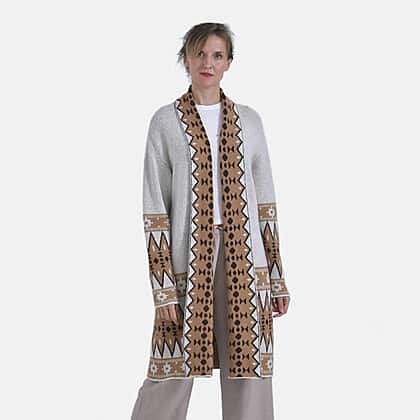 Refresh your style with the La Marey cardigan, designed with an open-front feature that allows for effortless layering. Its striking, irregular graphic patterns seamlessly blend contemporary and traditional influences, creating a truly eye-catching piece. The knee-length cut (85cm) adds a flattering silhouette, making it a perfect choice to pair with trousers, jeans, or dresses. Crafted from a premium blend of 45% acrylic, 30% polyester, and 25% nylon, it provides the ideal balance of comfort and durability for cooler weather. The warm tones of brown and beige, highlighted by intricate contrasting patterns, bring a refined yet versatile charm to your wardrobe.
