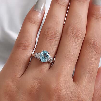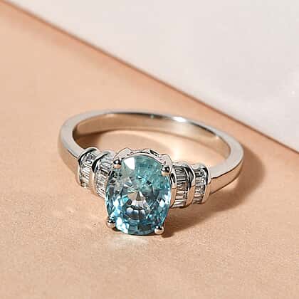 - CUT AND CARAT: The oval shaped Blue Ratanakiri Zircon exhibits light blue flashes along with white-blue hues in a multifaceted surface. The baguette cut diamonds are embellished on the flanks in two rows