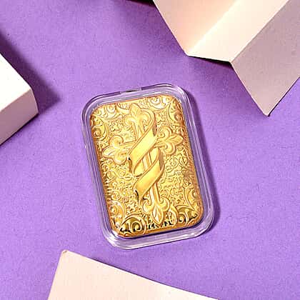 Just a gold collectible that will remind you of your faith! This 24K yellow gold collectible features a fleur-de-lis cross at the centre wrapped around with a ribbon-like detailing. The collectible is further enhanced with ornate swirling designs that helps to add a timeless luxe look to it. It features curved edges which helps to add a sense of gracefulness to the design. It makes for a unique keepsake that can be passed on to generations or a piece of investment. It can also symbolise hope and belief in the higher power, thus can also make for an enduring emblem of your faith.