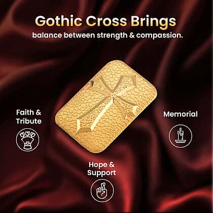 Designed to inspire, this 24K yellow gold embossed gothic cross is a striking emblem of faith, strength, and spiritual resilience. Featuring an intricate raised cross against a textured backdrop, the AU999 purity bar gleams with a luminous finish and fine detailing. Housed in a clear protective case, it's ideal for meaningful gifting or personal reflection. This piece speaks to heritage and symbolism, making it a valuable keepsake with lasting visual appeal. Whether displayed or given as a token of belief, it's a powerful way to express conviction through artistry and precious metal.