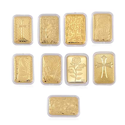 Step into a world of myth, grace and meaning with this Set of 9 Collectable designs in radiant 24K yellow gold. Each piece—Cross, Lady Fortuna, Dragon, Golden Grace, Tree, Snake, Dragon Face, Rose and Gothic Cross—tells its own story, crafted in exquisite detail. Made from hypoallergenic, tarnish-resistant gold, these treasures promise timeless shine and durability. Whether symbolic of luck, strength, spirituality or beauty, every motif appeals to the collector’s heart. Encased in clear capsules for pristine preservation, this striking set brings sentiment, elegance and craftsmanship into one unforgettable keepsake collection that makes an inspiring gift or personal treasure.