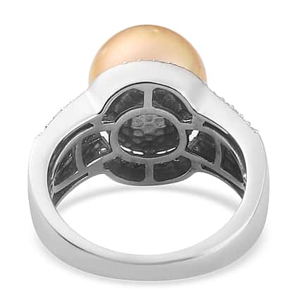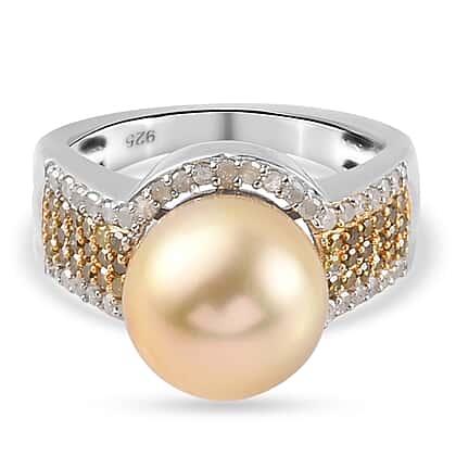 Golden South Sea Pearl , Yellow Diamond , White Diamond Main Stone With Surrounding Stone Ring in Platinum Overlay Sterling Silver 0.60 ct, Silver Wt. 8.48 Gms 0.600 Ct.
