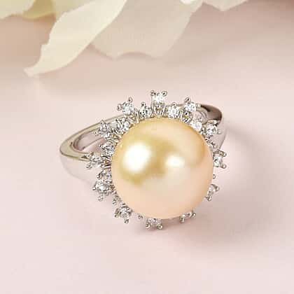 Golden South Sea Pearl and Natural Zircon Ring in Platinum Overlay Sterling Silver